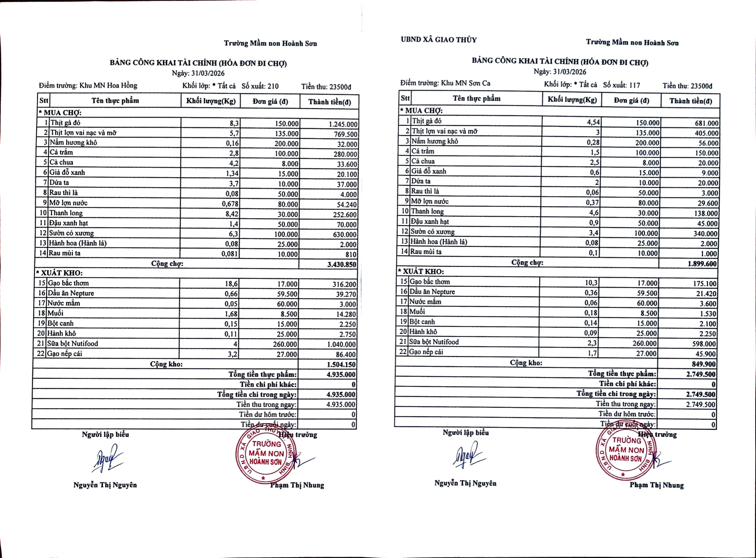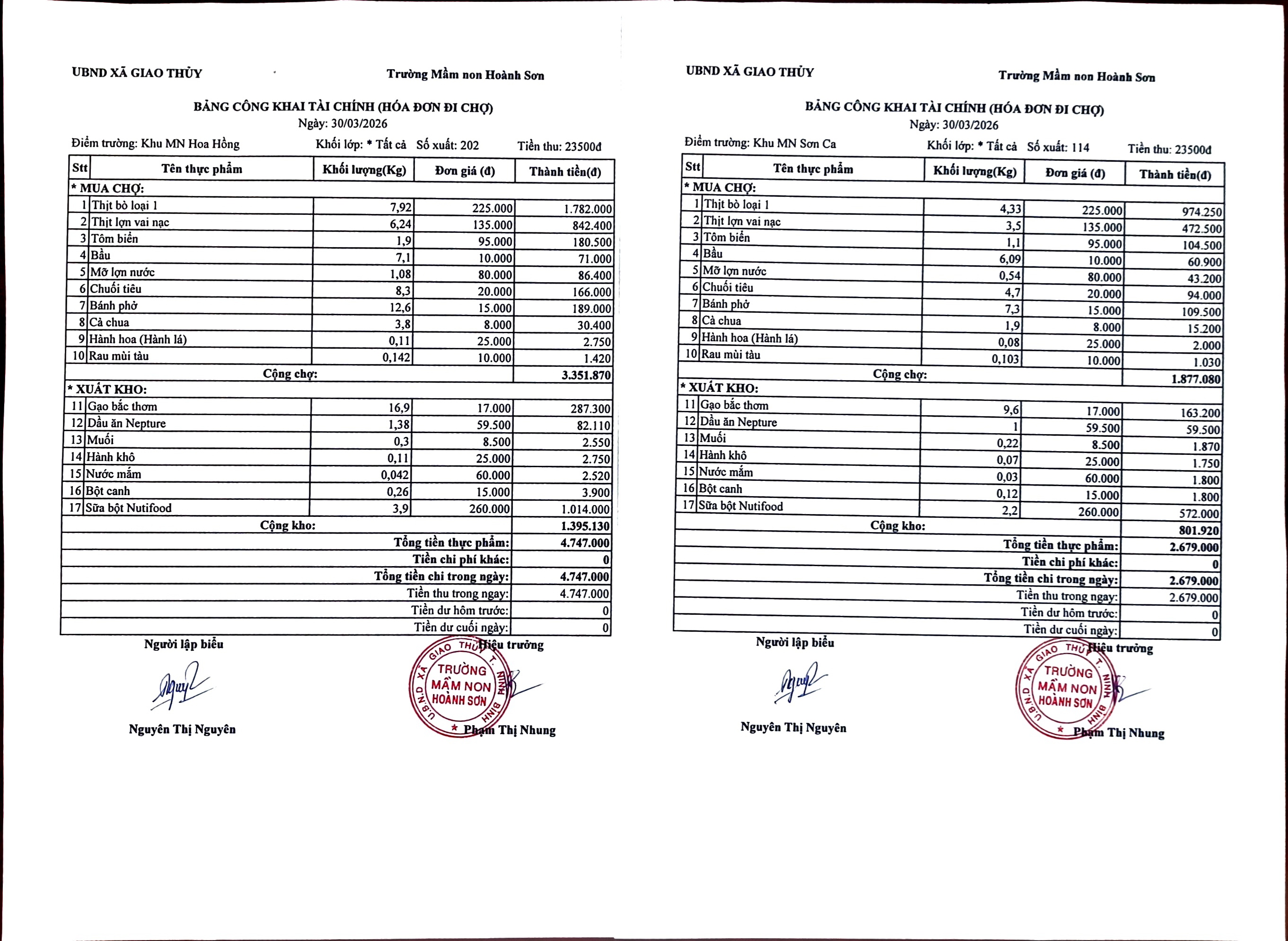 BẢNG CÔNG KHAI TÀI CHÍNH ( HÓA ĐƠN ĐI CHỢ) THỨ HAI NGÀY 30 THÁNG 3 NĂM 2026