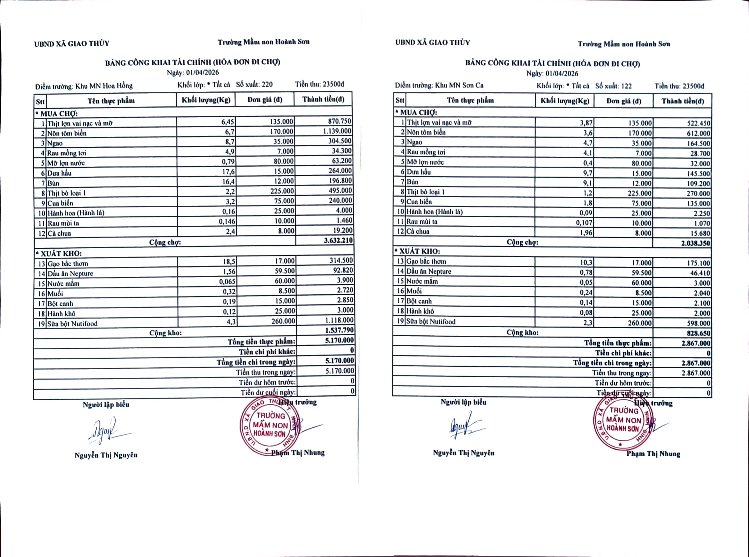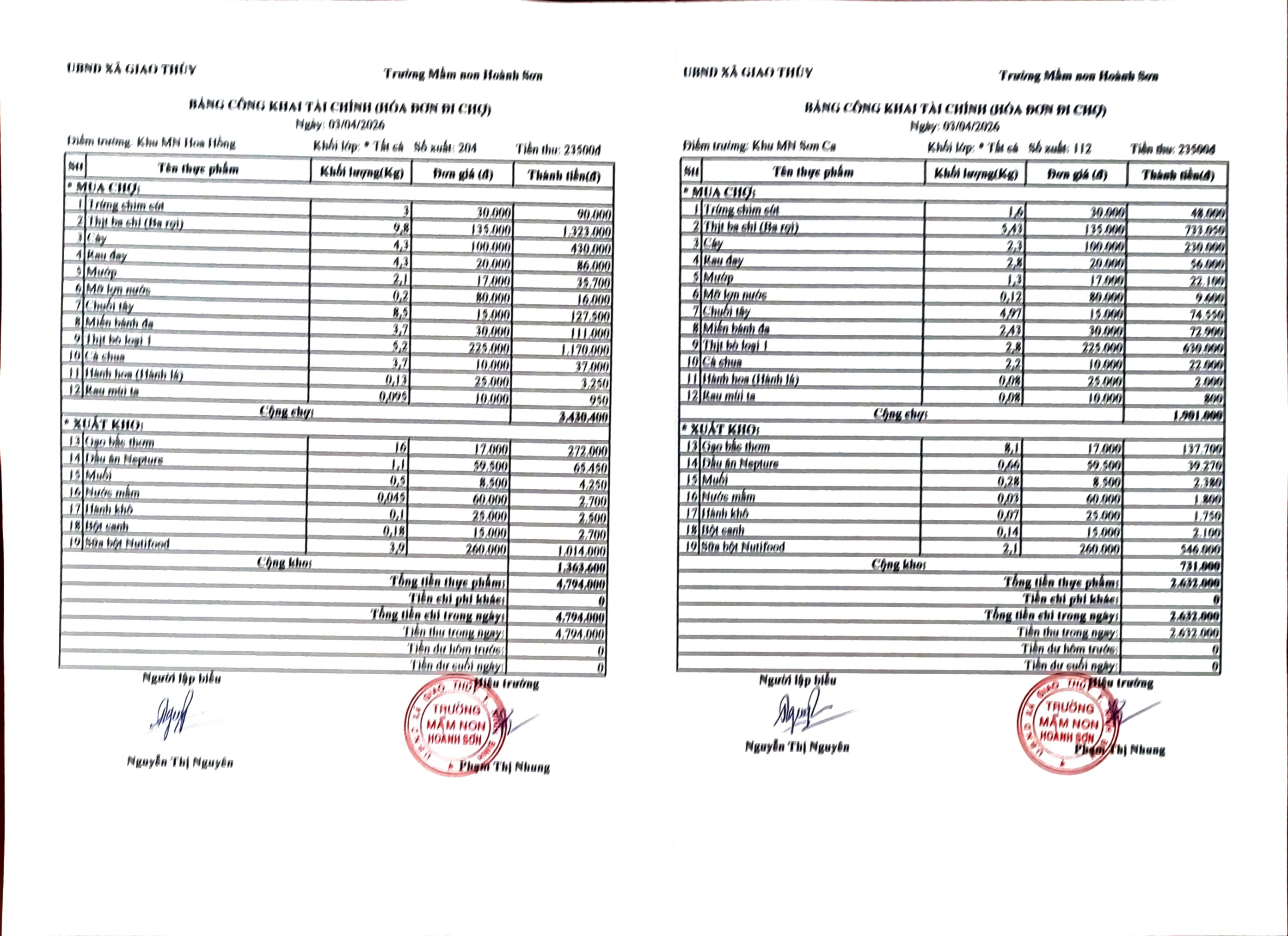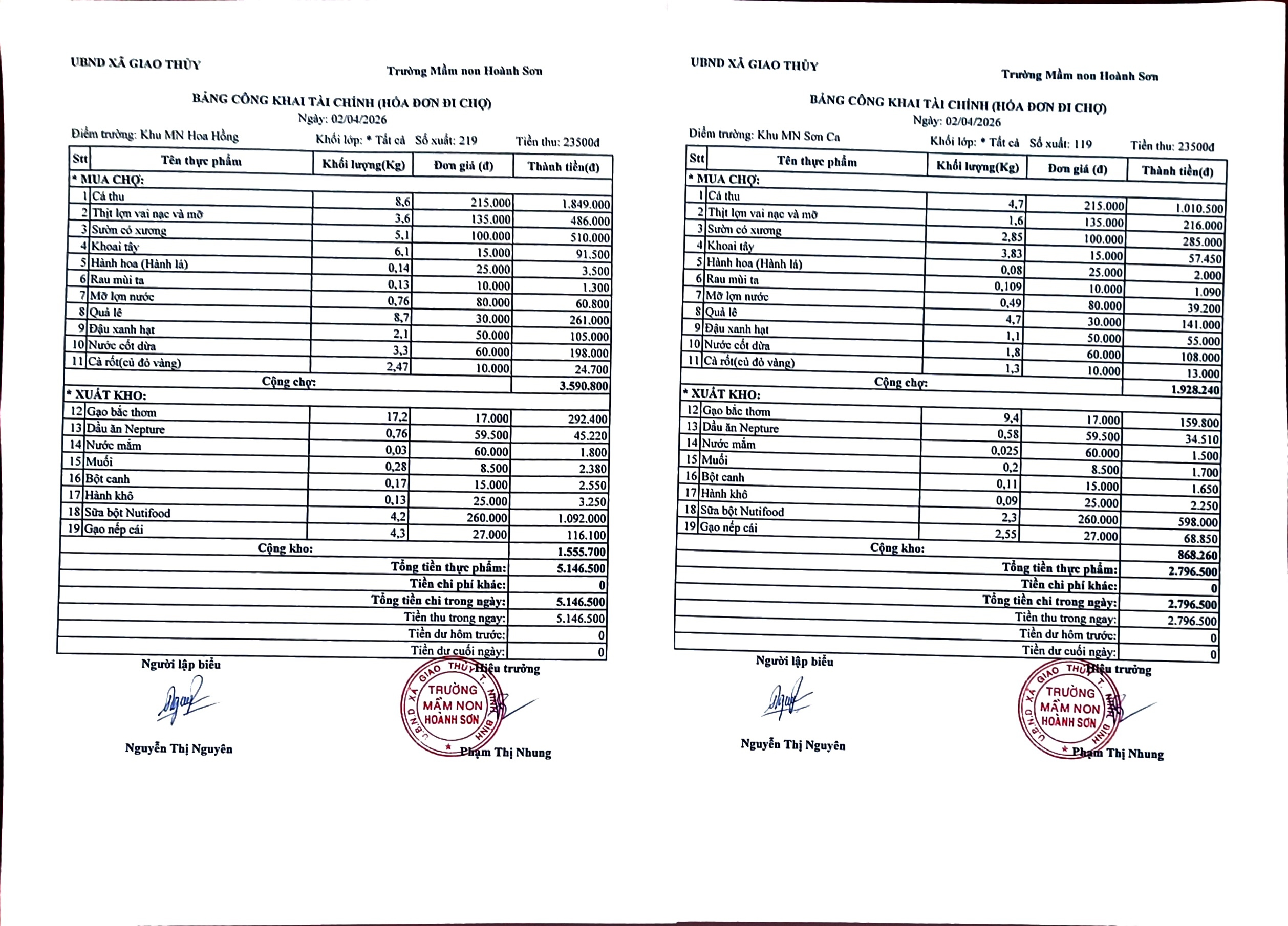 BẢNG CÔNG KHAI TÀI CHÍNH ( HÓA ĐƠN ĐI CHỢ) THỨ NĂM NGÀY 02 THÁNG 4 NĂM 2026